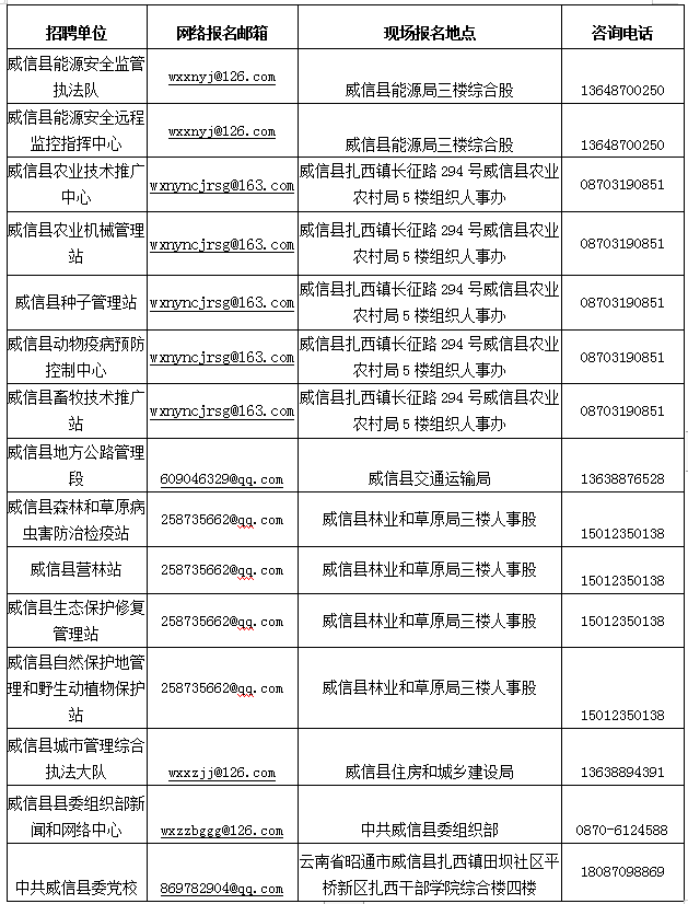 威信县2024年事业单位公开招聘优秀紧缺高层次专业技术人才通告为进一步加强专业技术人才队伍建设、促进经济社会各项事业发展,根据《昭通市2024年事业单位公开招聘优秀紧缺专业技术人才实施办法》的有关规定,经昭通市人力资源和社会保障局批准,现将威信县2024年事业单位公开招聘优秀紧缺高层次专业技术人才相关事宜通告如下:坚持“公开、公平、竞争、择优”的原则;坚持尊重知识、尊重人才、学以致用、专业对口的原则;坚持考试与考核相结合的原则;坚持“信息公开、过程公开和结果公开”,并接受纪检监察和社会各界监督的原则。本次计划招聘22人,具体招聘岗位及条件详见《威信县2024年事业单位公开招聘优秀紧缺高层次专业技术人才简章》(附件1)。1.具有中华人民共和国国籍,享有中国公民政治权利,遵守宪法和法律,拥护中国共产党的领导,坚持四项基本原则,具有强烈的责任心和事业感。3.具有岗位所需的学历、专业要求、履职资格条件、文化水平和专业知识。4.普通招生计划2024年毕业的本科毕业生和普通招生计划近5年(2020年至2024年)毕业的硕士研究生及以上学历毕业生,优先招聘博士学位和硕士学位研究生。5.年龄在18周岁以上,35周岁以下(1988年8月至2006年8月期间出生)。8. 国(境)外毕业生须提供教育部国(境)外学历、学位认证书。(二)公开招聘优秀紧缺高层次专业技术人才除需具备第(一)条的基本条件外,还需具备下列学历条件1. 中共威信县委组织部新闻和网络中心、威信县城市管理综合执法大队岗位,需具备普通招生计划近5年(2020年至2024年)毕业的硕士研究生及以上学历,并取得硕士及以上学位。2.中国共产党威信县委员会党校、威信县地方公路管理段、威信县森林和草原病虫害防治检疫站、威信县营林站、威信县生态保护修复管理站、威信县自然保护地管理和野生动植物保护站、威信县农业技术推广中心、威信县农业机械管理站、威信县种子管理站、威信县动物疫病预防控制中心、威信县畜牧技术推广站、威信县能源安全远程指挥中心、威信县能源安全监管执法队、威信县城市管理综合执法大队岗位,需具备“双一流”建设高校(2017年9月20日国家公布的世界一流大学建设高校、一流学科建设高校相对应的一流建设学科;2017年9月20日国家正式发布“双一流”高校名单以前的原985、211工程院校)普通招生计划本科学历,并取得学士学位(以高考录取时为准);或者普通招生计划近5年(2020年至2024年)毕业的硕士研究生及以上学历,并取得硕士及以上学位。报考人员须按要求如实提供有关信息和材料,所学专业以毕业证上的专业名称为准。本科毕业生所学专业必须与报考岗位的专业要求相同;研究生岗位可放宽到相近专业,具体专业是否符合岗位要求,由用人单位结合本单位职能确定。3. 截止报名时已经录(聘)用为机关事业单位的在职在编人员的。4. 招聘后即构成《事业单位人事管理回避规定》第六条所列回避情形的人员。5. 受到党纪、政纪处分期限未满或者正在接受纪律审查的;正在接受司法调查尚未作出结论的。6. 被开除中国共产党党籍的人员、因犯罪受过刑事处罚的人员、被开除公职的人员、吸毒人员、被依法列为失信联合惩戒对象的人员、在以往事业单位录用考试中被认定有舞弊等严重违反录用纪律行为的人员,以及法律法规规定不得录用为事业单位工作人员的其他情况的人员。7. 法律法规规定不得录用为事业单位工作人员的其他情况人员。报名采用网络报名和现场报名相结合的方式进行,任选其中一种方式报名即可。1.网络报名时间:自通告发布之日起至1月10日24:00止;具体报名邮箱见下表。2.高校现场报名时间及地点:2023年12月28日上午10时至17时;云南大学呈贡校区中山邦翰楼负一楼。3.单位现场报名时间:2023年12月25日至12月29日早上8:30-11:30,下午14:30-17:30;具体报名方式和报名地址见下表。