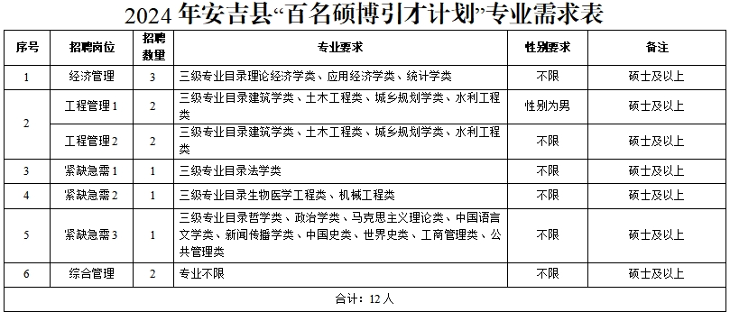 结合我县紧缺急需专业人才需求,计划引进经济金融、工程建设等紧缺急需领域硕博人才12名。具体招聘职位、人数及要求详见附件。